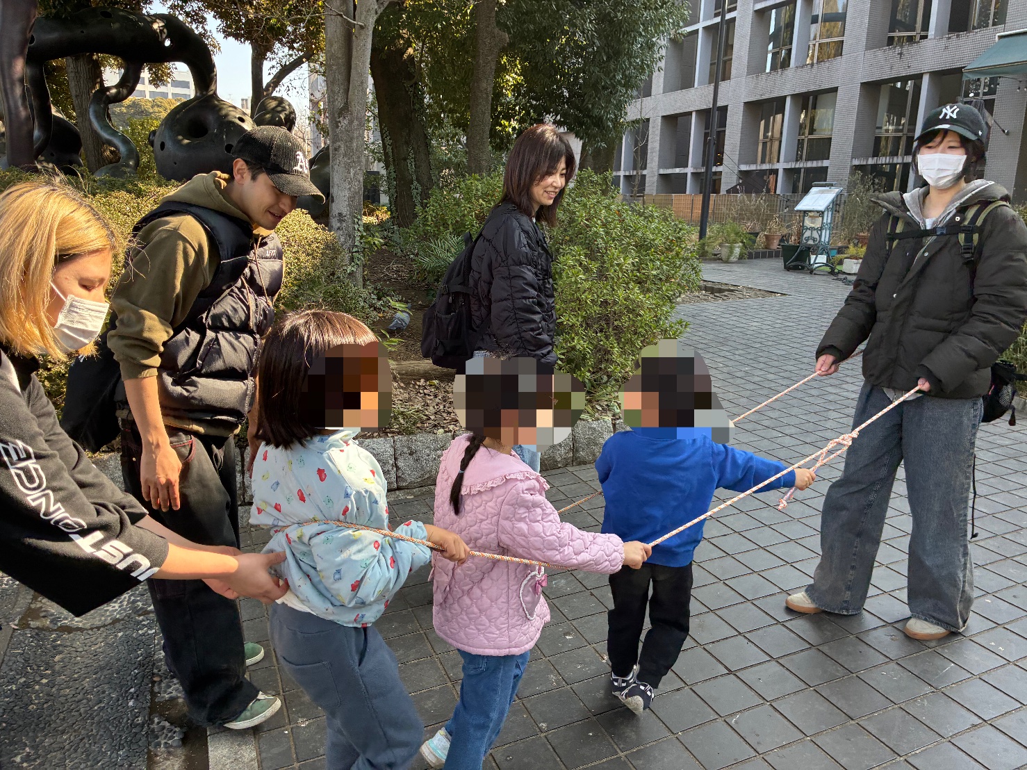 公園内の移動はロープを使って「電車あそび」にして、みんなでつながって出発!順番を守って楽しく一緒に移動できました✨ 前のお友だちに合わせて歩き、 集団のペースを意識する向上を図れます✨